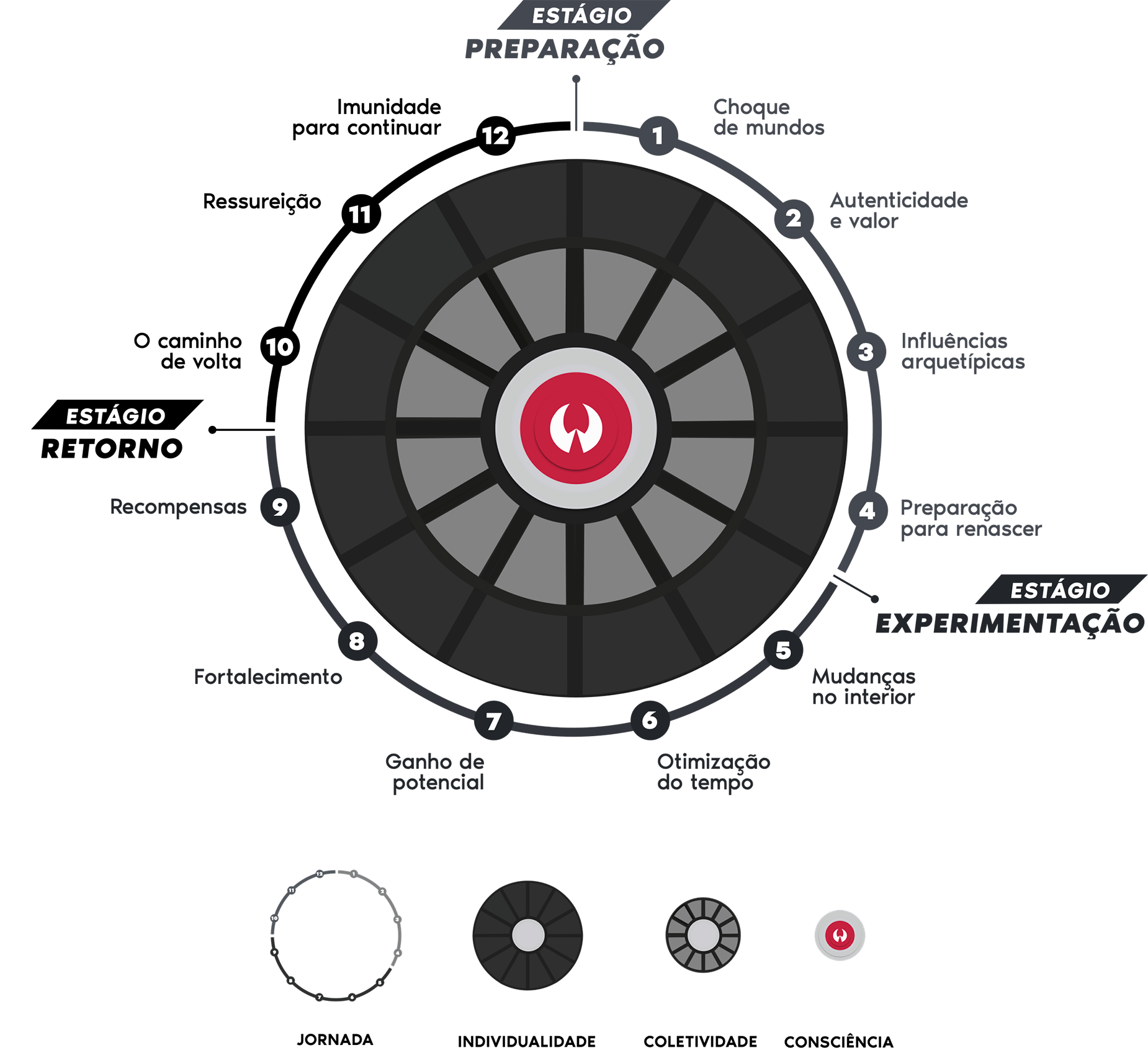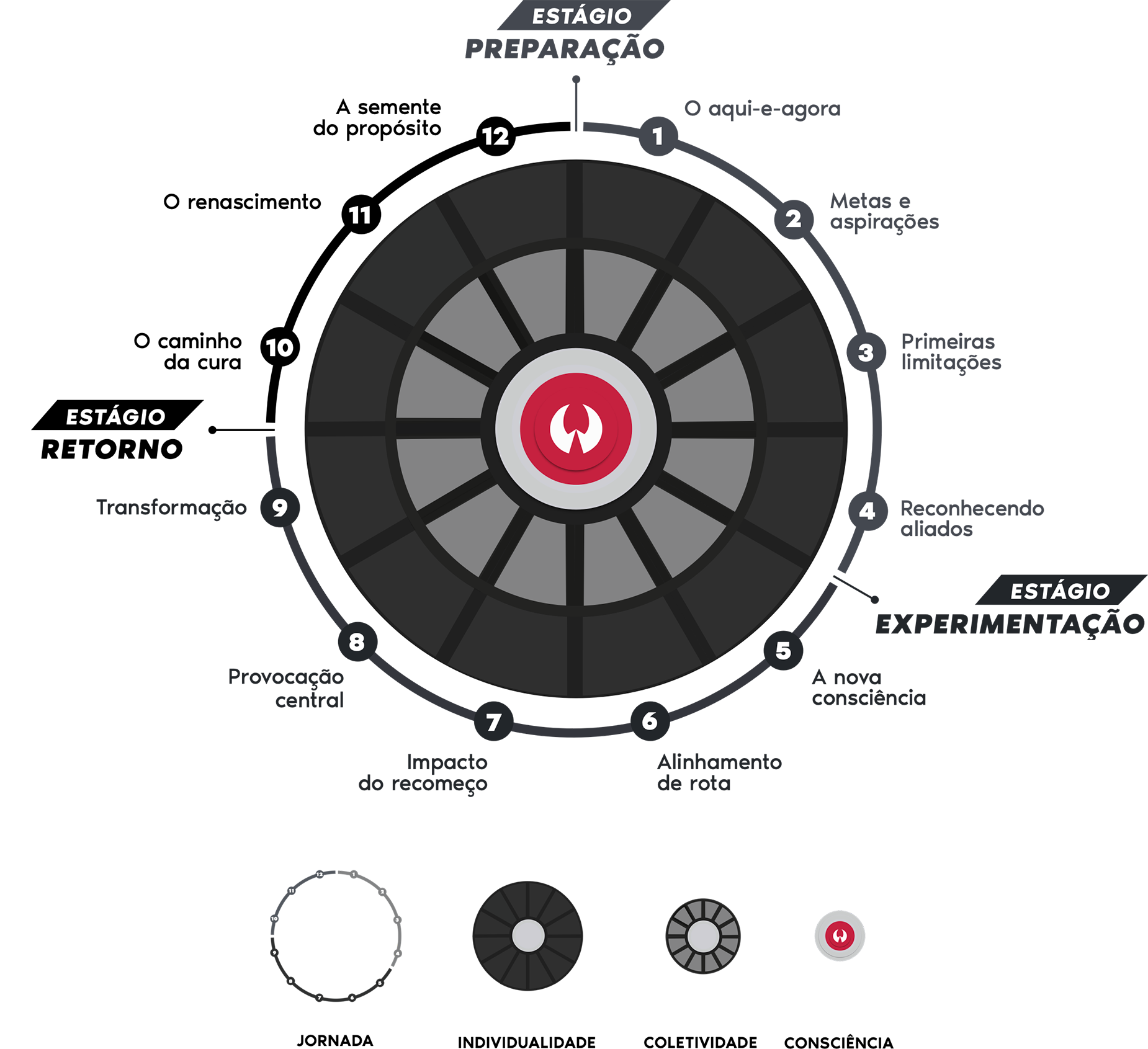 Composta por 12 ciclos e 3 estágios de ruptura, a jornada individual e coletiva são técnicas inspiradas na psicologia analítica e centradas numa relação dual autêntica sobre a ótica da gestalt-terapia. A busca pela ativação da alta consciência é a base central dos ciclos das jornadas, e orientada sobre o preceito de "libertação como ganho de propósito”.